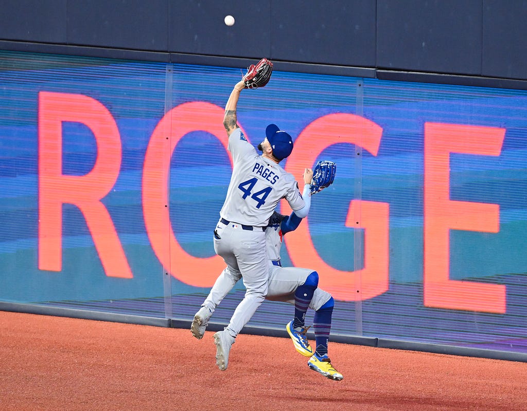 Bases loaded and two outs. Andy Pages replaced Edman in center field before the Varsho at-bat. He was shaded slightly to the left side of second base for Blue Jays third baseman Ernie Clement. Clement walloped a Yamamoto pitch, driving it deep to left center field with a 100.7 mph exit velocity off the bat.