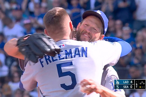What was also “amazingly special” is that when removed from the game after striking out Mariners third baseman Eugenio Suárez for the first out of the bottom of the sixth inning on a filthy (and unhittable) 85.5-MPH slider, it wasn’t Dodgers manager Dave Roberts who walked out to the mound to pull him, it was his teammate and very close friend Freddie Freeman who did the honor – to a T-Mobile Park standing ovation. (Roberts had pulled Freeman from the game in the top of the fifth inning). The popular Dodgers first baseman gave Kershaw a huge hug and let him keep the “amazingly special” game ball.