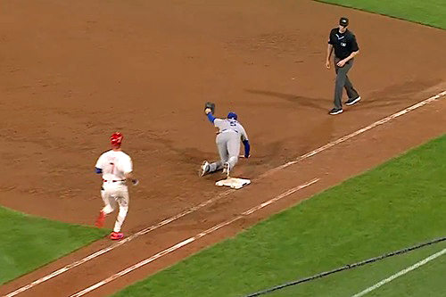 On Vesia’s second pitch to Stott, he dropped down a bunt that was fielded by hard charging Dodgers third baseman Max Muncy, who turned and fired a dart to Dodgers shortstop Mookie Betts, who tagged out a sliding Castellanos at third base for the (huge) first out of the inning. That said, Stott was now standing on first base representing the tying run. That play, which teams practice extensively during Spring Training, is appropriately called a wheel play.