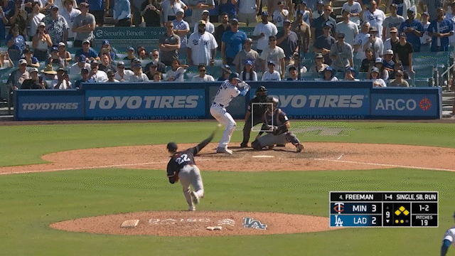 The Twins had at one point in the ninth inning a 95.3% win probability. Freeman’s swing had the biggest change in win probability for a Dodger hit all season.