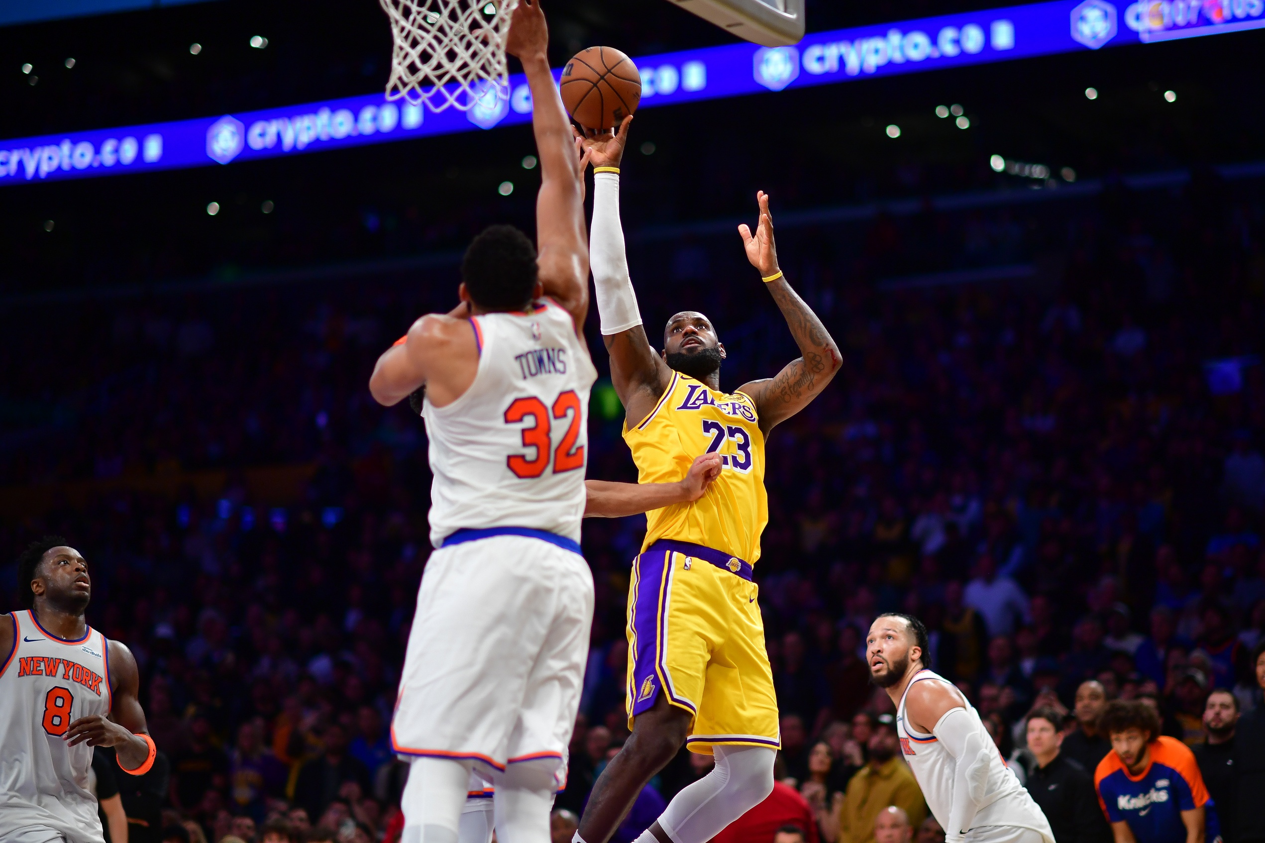 Mar 6, 2025; Los Angeles, California, USA; Los Angeles Lakers forward LeBron James (23) shoots against New York Knicks center Karl-Anthony Towns (32) during overtime at Crypto.com Arena. Mandatory Credit: Gary A. Vasquez-Imagn Images