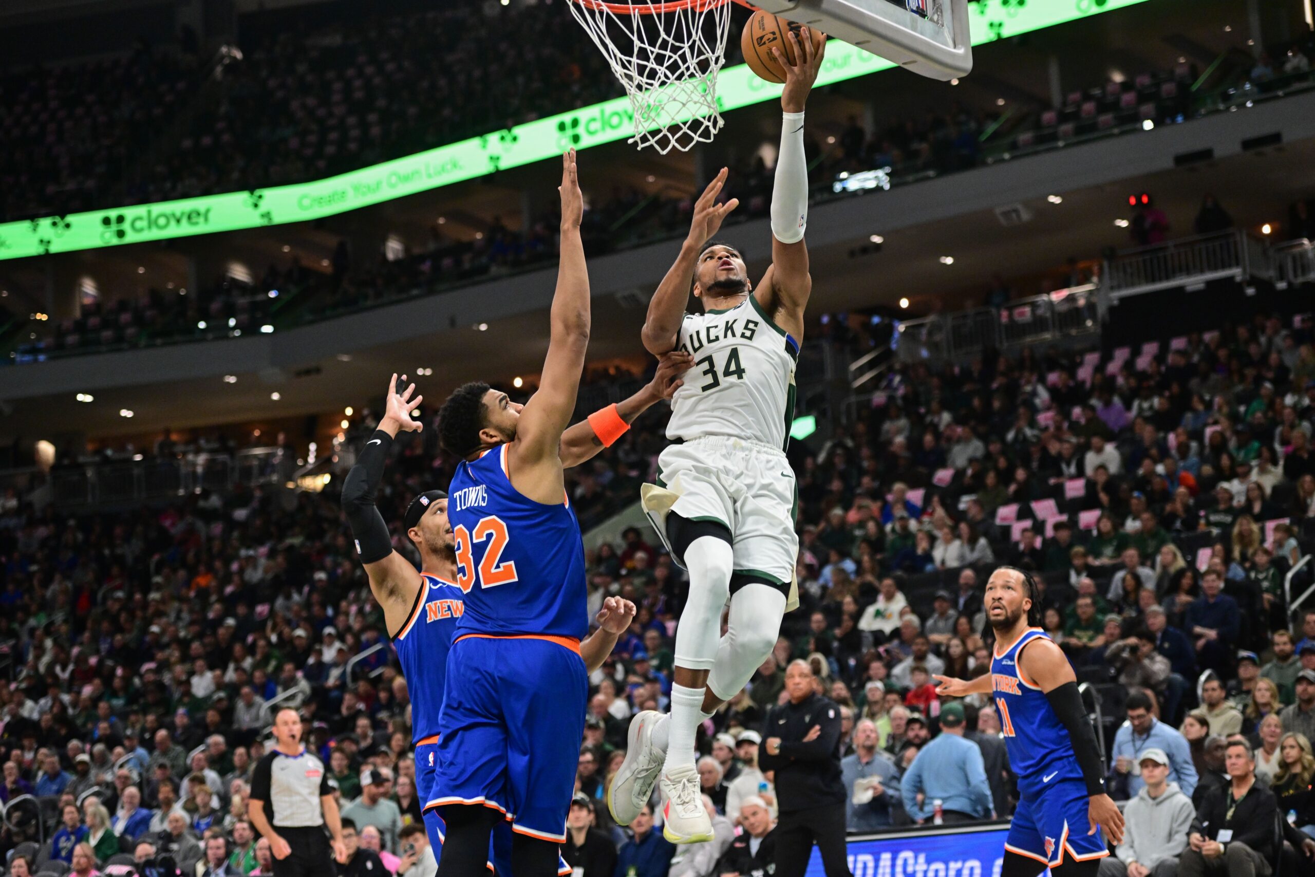 Oct 28, 2025; Milwaukee, Wisconsin, USA; Milwaukee Bucks forward Giannis Antetokounmpo (34) takes a shot against New York Knicks center Karl-Anthony Towns (32) in the second quarter at Fiserv Forum. Mandatory Credit: Benny Sieu-Imagn Images
