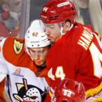 Ducks’ Tim Washe (42) battles with Calgary Flames’ Joel Hanley (44) during second-period NHL hockey game action in Calgary, Alberta, Sunday, Jan. 25, 2026. (Larry MacDougal/The Canadian Press via AP) Ducks goalie Lukas Dostal (1) makes a save against Calgary Flames’ Matt Coronato (27) during first-period NHL hockey game action in Calgary, Alberta, Sunday, Jan. 25, 2026. (Larry … [Read more...] about Beckett Sennecke earns 1st NHL hat trick with OT goal in Ducks’ rally over Flames