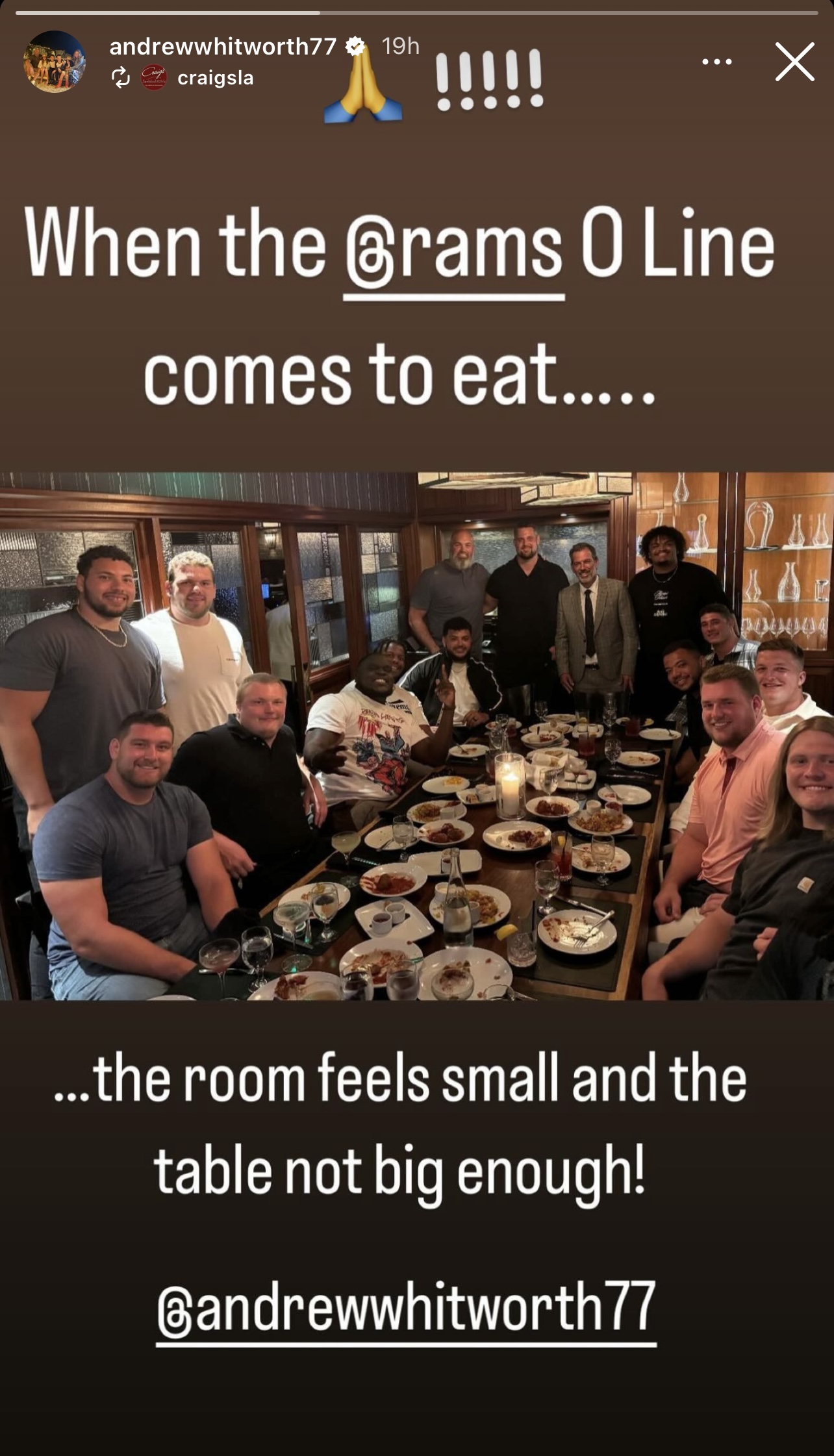 Recently, he and the Rams’ O-line all had dinner together at Craig’s in Los Angeles, reconnecting with some of the guys he played with – including Rob Havenstein and Joe Noteboom.
